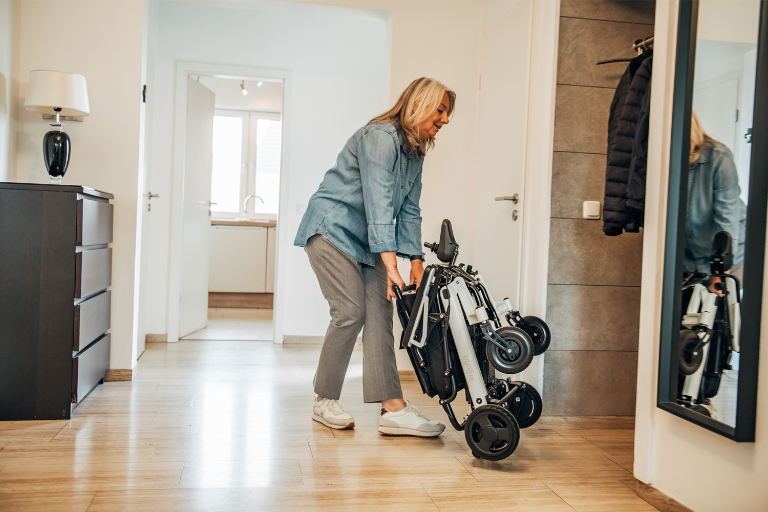 Neuere Modelle sind nicht nur handlich, in manchen Fällen sogar faltbar. Selbst, wenn Du den Elektrorollstuhl in der Wohnung nicht nutzt, sondern ihn nur in Deiner Nähe wissen möchtest: Diese Eigenschaft ist Gold wert. Zusammengeklappt lässt sich das Hilfsmittel so praktisch in einer Ecke verstauen, ohne im Weg zu stehen.